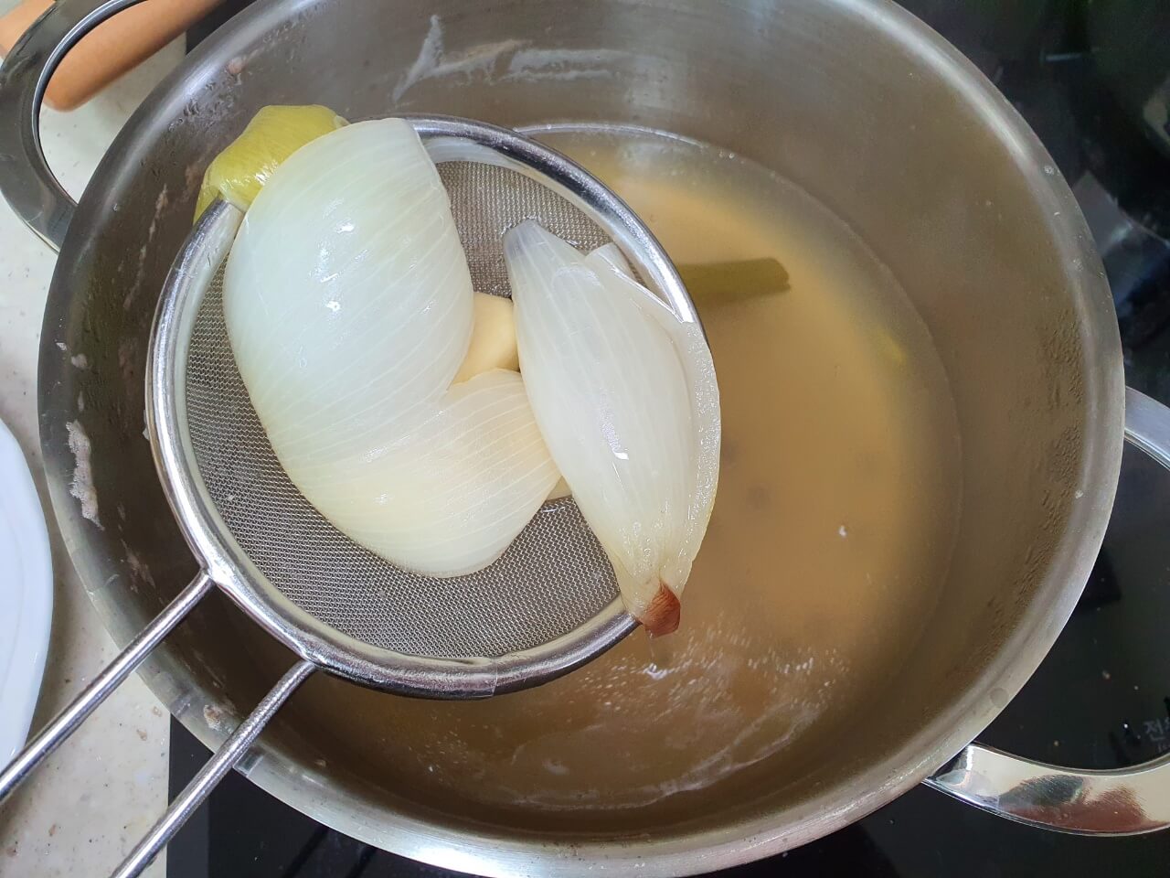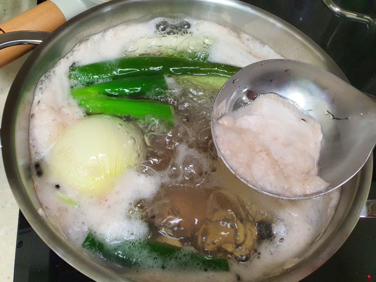물에 마늘, 대파, 양파, 통후추, 맛술을 넣고 30분 이상 푹 삶아 주세요.