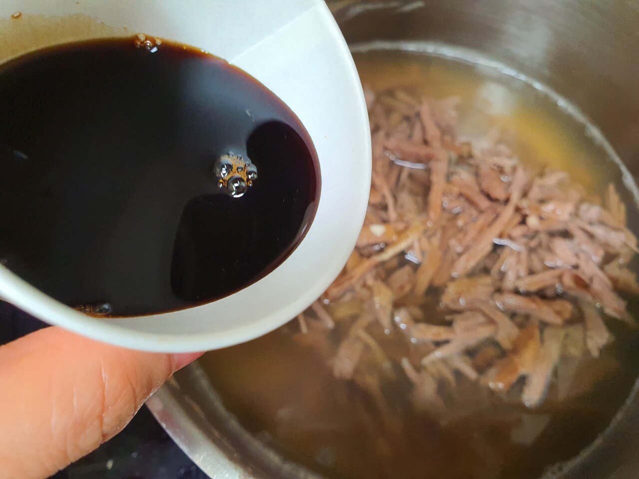 ☞ 체에 거른 육수를 냄비에 붓고 간장, 설탕, 올리고당, 맛술을 넣고 삶아주세요.
